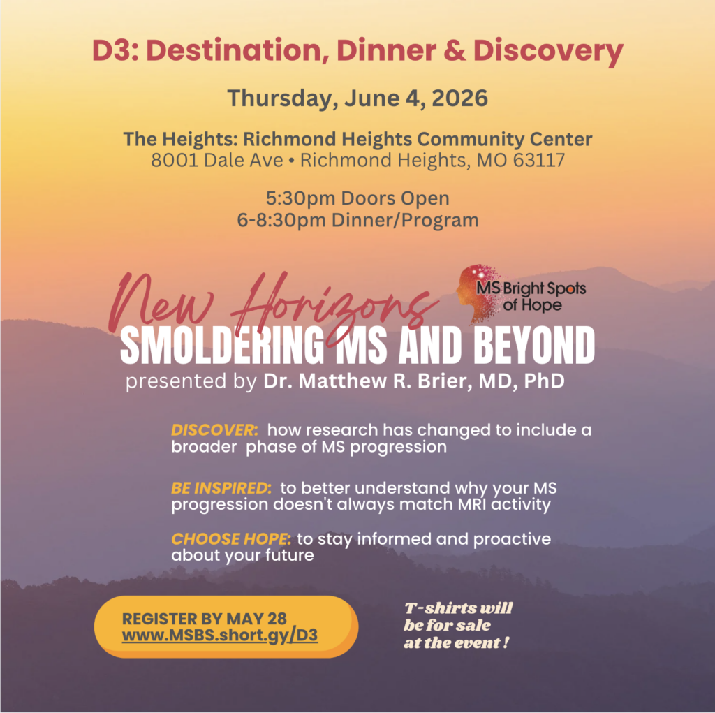 This quarterly dinner series (D3) brings people together for a relaxed evening of connection, conversation, and learning. Enjoy a delicious, complimentary dinner while spending time with friends, meeting others in the MS community, and gaining insights that support life with MS.